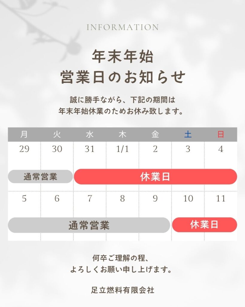 年末年始の営業日につきまして、下記の通りご案内いたします。